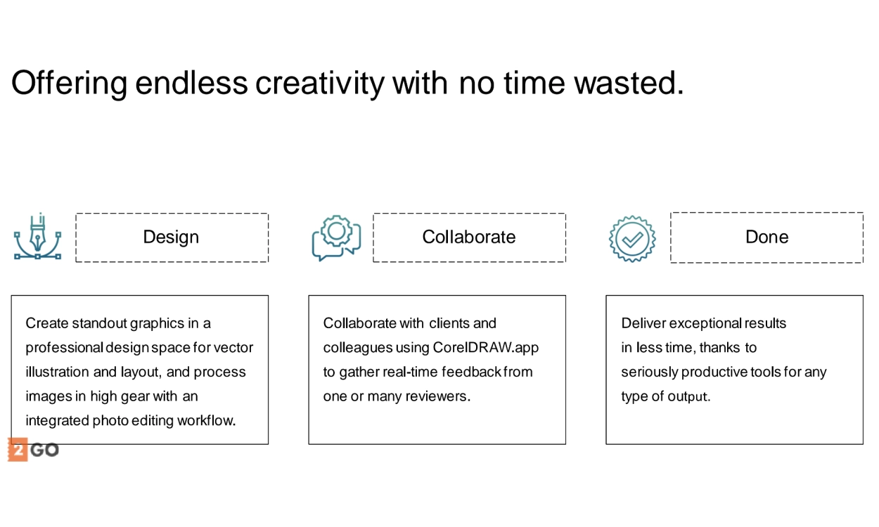 Time is one of our most valuable resources, and CorelDRAW® is ready to make sure you don't waste it. Tackle client projects faster with cutting-edge new illustration and photo editing tools that simplify complex workflows and accelerate project configuration, so you can spend more time doing what you should never be in a hurry to do: get creative. Take advantage of breakthrough collaboration tools to streamline the revision process for your designs. Wasting time on a mountain of PDFs, emails and attachments is now truly a thing of the past.