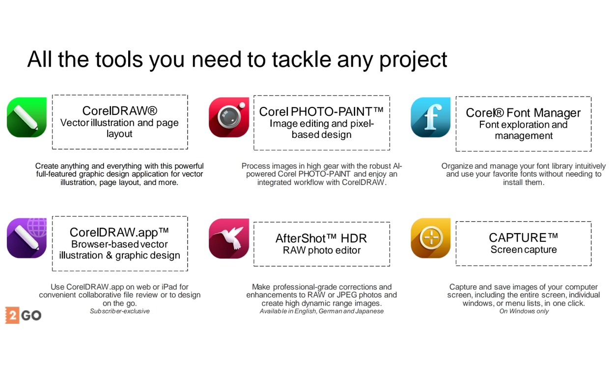 - CorelDRAW.app™ - online vector illustration and graphic design via a web browser CAPTURE™ - screen capture tool (EXCLUSIVE FOR SUBSCRIBERS)