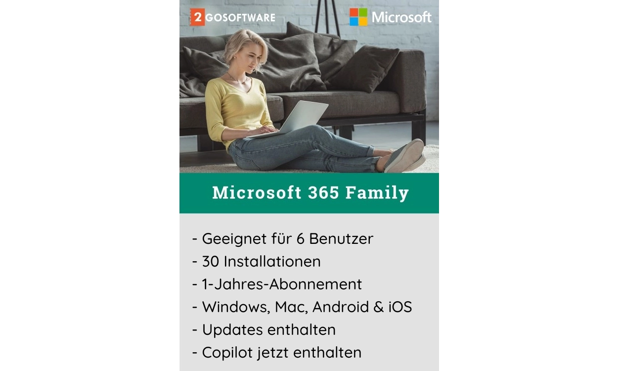 Microsoft 365 Family eignet sich für 6 Benutzer, und jeder Benutzer kann die Software auf bis zu 5 Geräten installieren. Diese Lizenz ist nur für den persönlichen Gebrauch bestimmt und nicht für geschäftliche Zwecke. Für geschäftliche Nutzung bieten wir spezielle Microsoft-Software für Unternehmen.