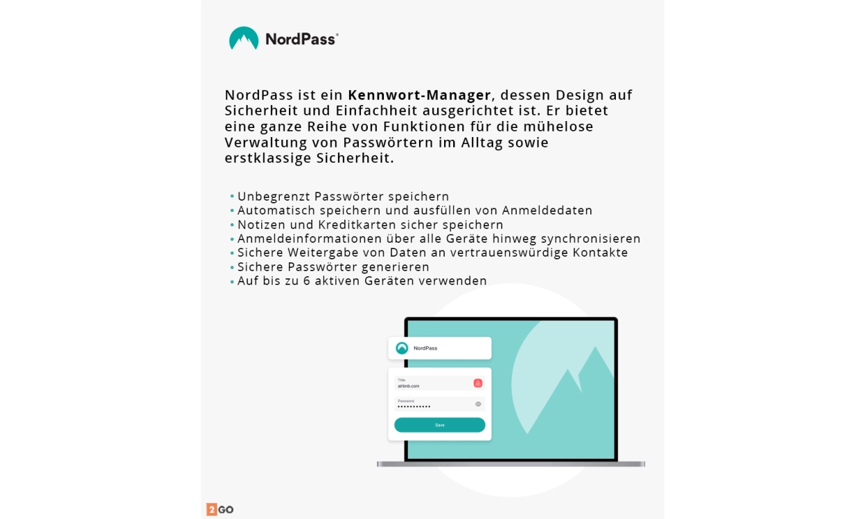 Durch die Verwendung verschiedener IP-Adressen können Sie auf Websites und Online-Dienste zugreifen, die Sie sonst nicht nutzen könnten, weil sie sonst blockiert wären. NordVPN kann auf all Ihren Windows-, Mac-, Linux- und Smartphone-Geräten installiert werden. Es sind sogar verschlüsselte Proxy-Erweiterungen für Chrome und Firefox verfügbar. Außerdem können Sie mit einem einzigen NordVPN-Konto bis zu 10 Geräte sichern! Der Kauf bei 2GO Software bedeutet 100% legitime Software mit einer Installationsgarantie, einer Schritt-für-Schritt-Anleitung zum Herunterladen, Installieren und Aktivieren und einem Team von Spezialisten, die Ihnen gerne helfen, wenn Sie noch Probleme haben!
