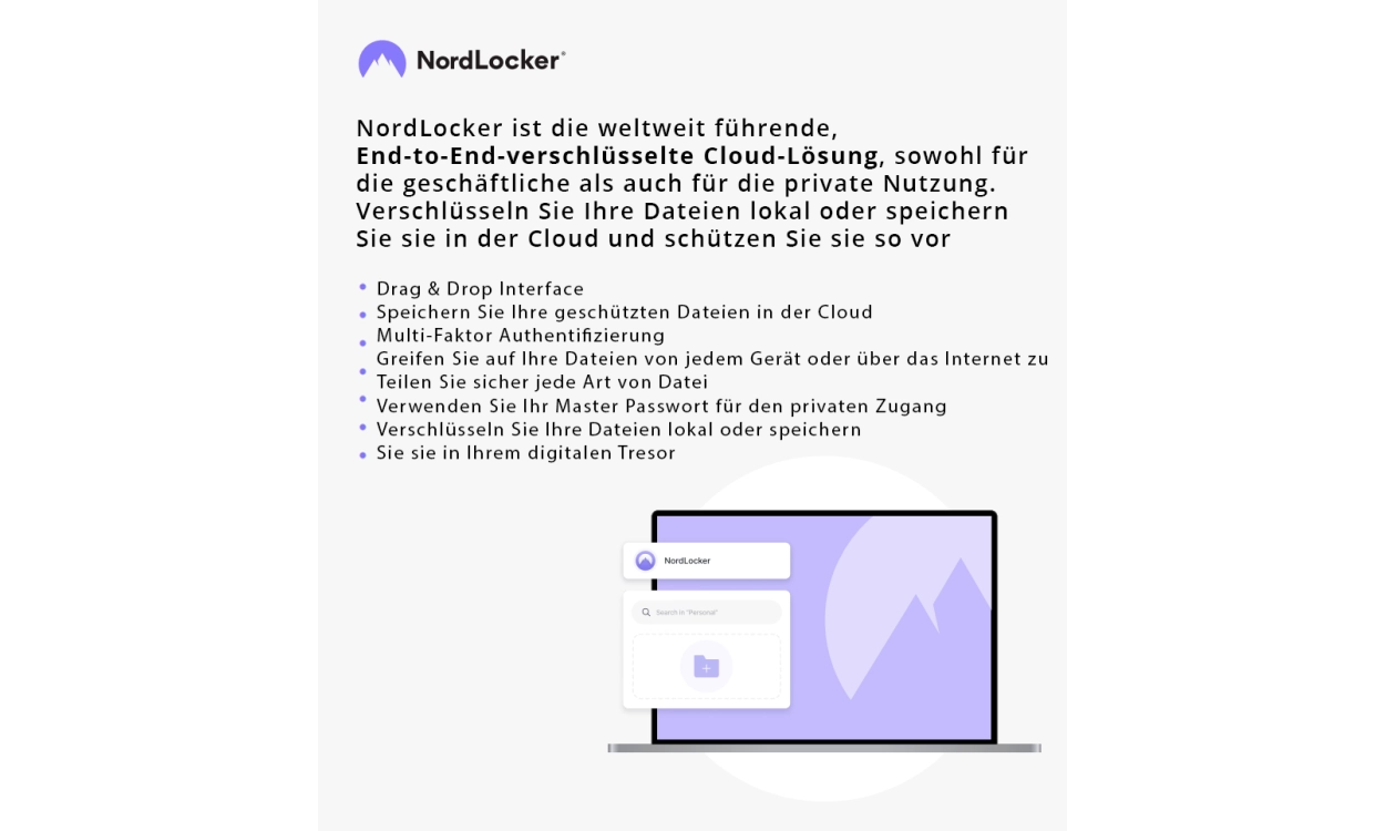 Natürlich wollen Sie wissen, was in diesem Komplett Abonnement noch enthalten ist. Das ist NordLocker. Dies sind 1 TB verschlüsselter Cloud-Speicher wo Sie alle Ihre Dateien in einer sicheren Umgebung aufbewahren und jederzeit aus der Ferne abrufen können. Ganz gleich, ob auf eigenen privaten Computer oder von einem öffentlichen Computer aus, Sie können immer sicher darauf zugreifen, ohne sich Sorgen machen zu müssen. Eine Datei gemeinsam nutzen? Das ist kein Problem. Sie können verschlüsselte Links mit einem einzigartigen Code an jeden senden, den Sie möchten. Wenn Ihr Laptop oder Computer kaputt geht oder Sie ihn verlieren, sind zumindest Ihre Dateien nicht verloren. NordLocker erstellt automatisch eine Sicherungskopie Ihrer Dateien.