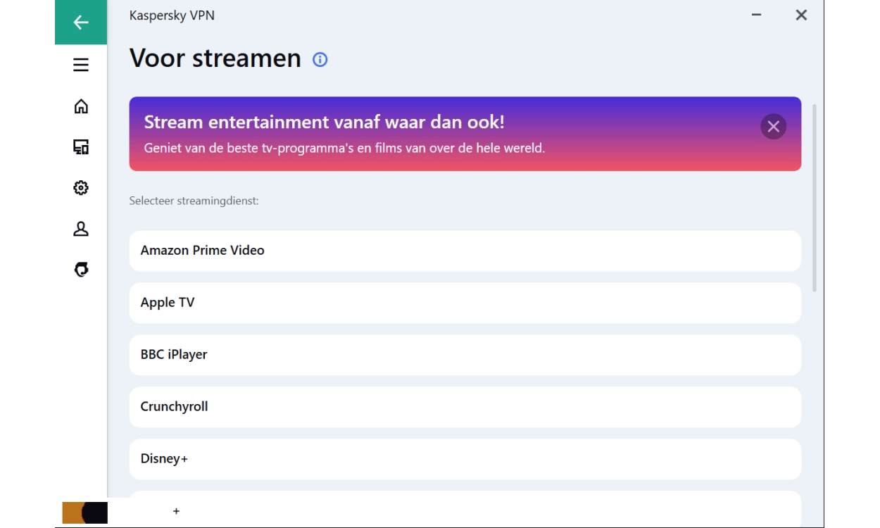 Met de onbeperkte en snelle VPN (Virtual Private Network) heb je volledige online privacy zonder dat dit ten koste gaat van de snelheid. Dankzij de gegevensbeveiliging op openbare wifi is jouw informatie beschermd tegen hackers, ongeacht wat je online doet. Je unieke IP-adres wordt verborgen door middel van IP-masking en bij een uitval van de VPN-verbinding, schakelt de Noodschakelaar in om te voorkomen dat je gegevens blootgesteld worden. Met toegang tot 2000 snelle servers over de hele wereld, heb je altijd toegang tot mondiale content, je favoriete websites, shows en films, inclusief die van Netflix en Amazon.