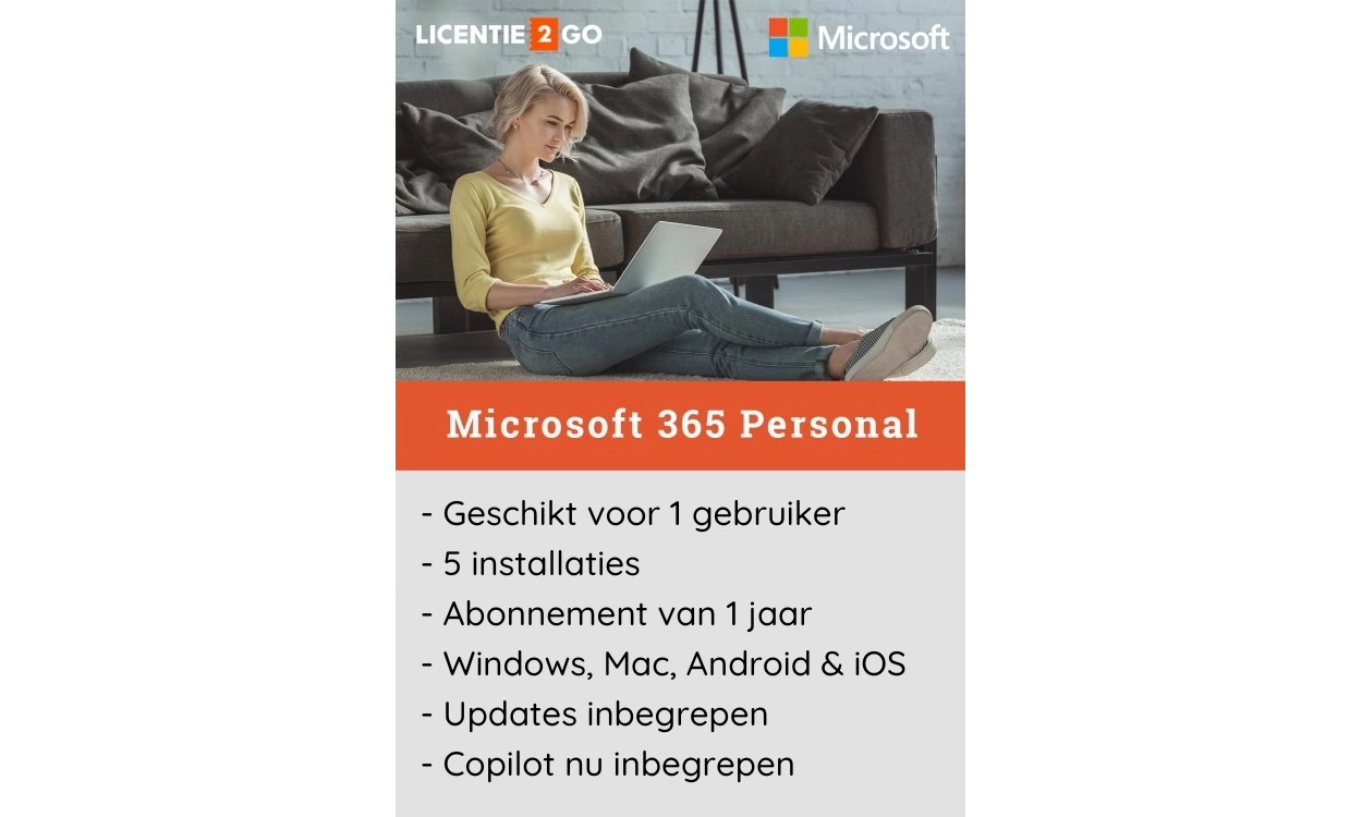 Microsoft 365 Personal is geschikt voor 1 gebruiker en kan geïnstalleerd worden op 5 apparaten. Deze licentie is alleen geschikt voor persoonlijk gebruik, voor zakelijk gebruik bieden we speciale Microsoft software voor bedrijven.