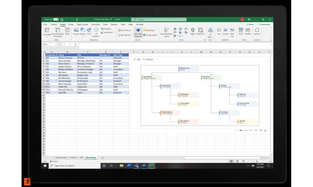 • Organisation charts linked to your data: Save time and reduce the error rate by automatically generating organisation charts from your sources such as Excel or Exchange.